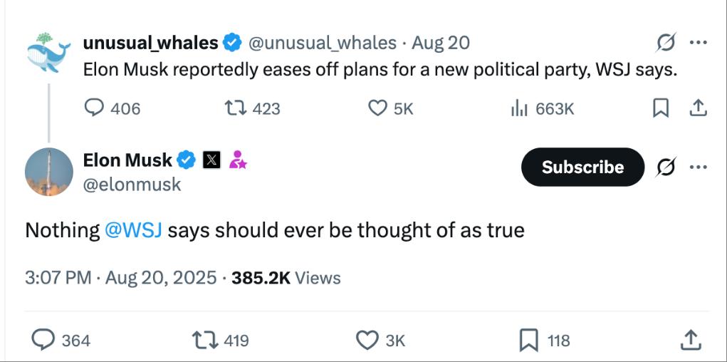 《华尔街日报》关于马斯克停止推进建立“美国党”报道的截图。