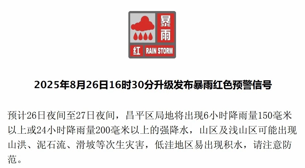 预计26日夜间至27日夜间,昌平区局地将出现6小时降雨量150毫米以上或24小时降雨量200毫米以上的强降水,山区及浅山区可能出现山洪、泥石流、滑坡等次生灾害,低洼地区易出现积水,请注意防范。