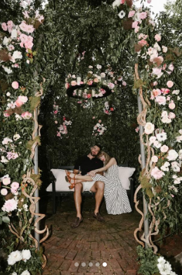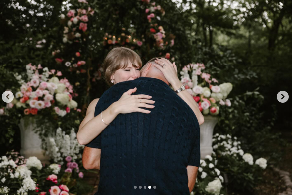 一组美照揭开了这一浪漫时刻的面纱:在一个鲜花盛开的秘密花园中,凯尔斯单膝下跪,向泰勒求婚,画面如电影般梦幻。