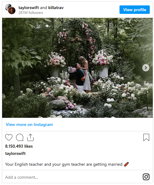 “你的英语老师和体育老师要结婚了,”两人在各自账号上发文写道,并配有一枚炸药棒的表情符号,甜炸了整个社交网络。