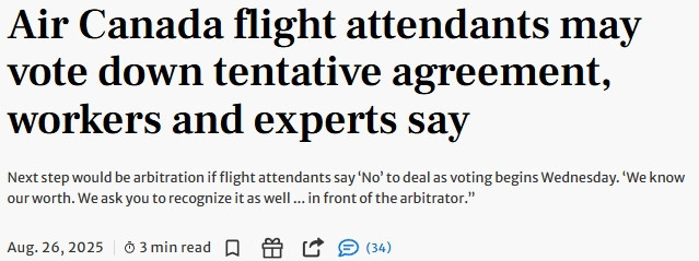 (Air Canada)1万名空乘人员将于本周三启动投票,决定是否接受公司最新的四年劳资协议。然而,不满情绪正在迅速蔓延,已有5100多名空乘签署联名请愿,要求“公平薪酬”,并警告可能否决协议。