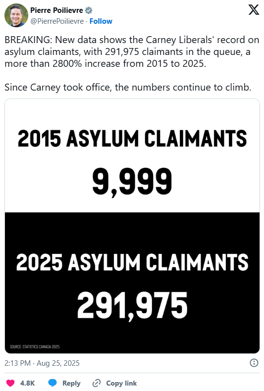 8月25日,博励治在社交平台X上说:“新数据显示,卡尼执政时期自由党在庇护申请(俗称申请)方面的记录显示,共有291,975名申请者在排队,从2015年(1万人)到2025年(29.1万人)增长了2800%以上。自卡尼上任以来,这一数字仍然持续攀升。”