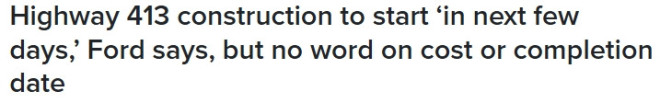 福特在周三表示,413号高速的施工将在“未来几天内”正式启动,但在被问及最终的总造价或完工时间 时,他并未给出明确答复。