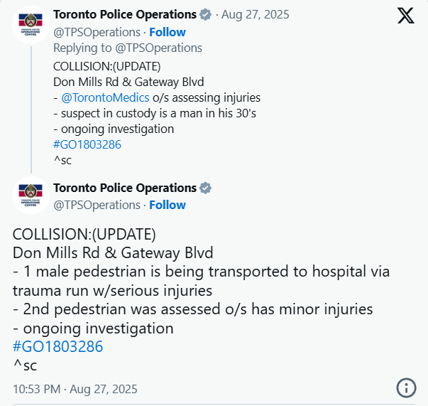 警方在晚上约10点20分接到报案,前往位于Don Mills Road和Gateway Boulevard的Flemingdon Park处理一起交通事故。