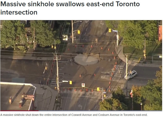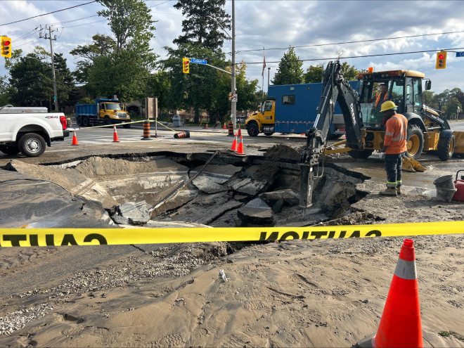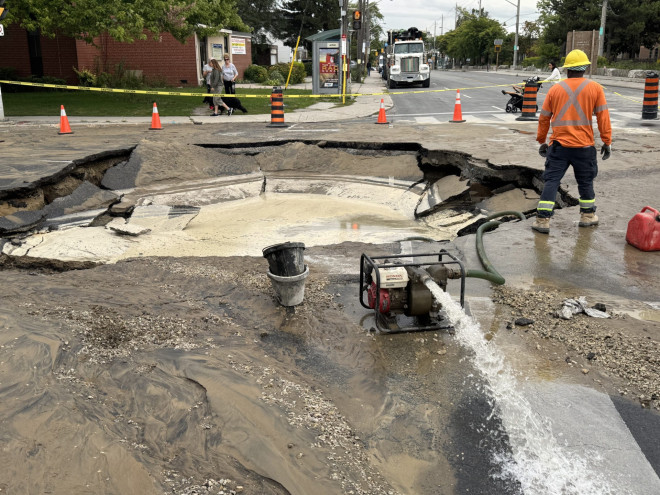 多伦多市政府在电子邮件声明中表示:“多伦多市正在积极应对周三深夜发生在Coxwell与Cosburn的供水主管道破裂事件。此次导致街道被淹、路面受损,并在路口形成塌陷。目前,市政府已接到两起地下室被淹的报告。”