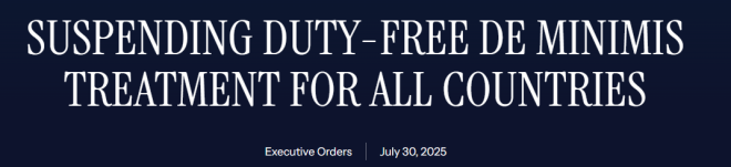 今年7月,美国总统特朗普签署了一项行政命令,规定从8月29日起,所有入境包裹都必须缴纳“所有适用关税”。在此之前,价值低于800美元的商品可以凭借所谓的“低值免税”(de minimis exemption)免关税进入美国。