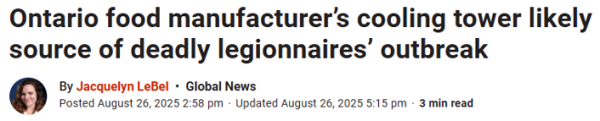 根据米德尔塞克斯-伦敦卫生局(MLHU)周二(8月26日)通报,经过数周的环境调查与样本检测,确认Sofina Foods Inc.——一家位于伦敦市东部的大型食品工厂,其冷却塔中所含的军团菌与本次疫情病例中的菌株完全匹配。