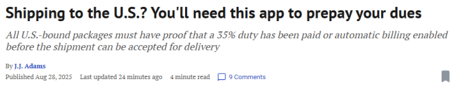 从今天(8月29日)起,人和企业在向寄送包裹时,迎来了一项重大变化——几乎所有商品都必须预付35%关税,才能入境美国。