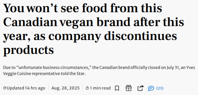 据Toronto Star报道,加拿大知名植物性餐牌Yves Veggie Cuisine已于7月31日正式关闭,其产品预计将在今年年底前彻底退出市场。关闭原因是“遗憾的商业状况”。