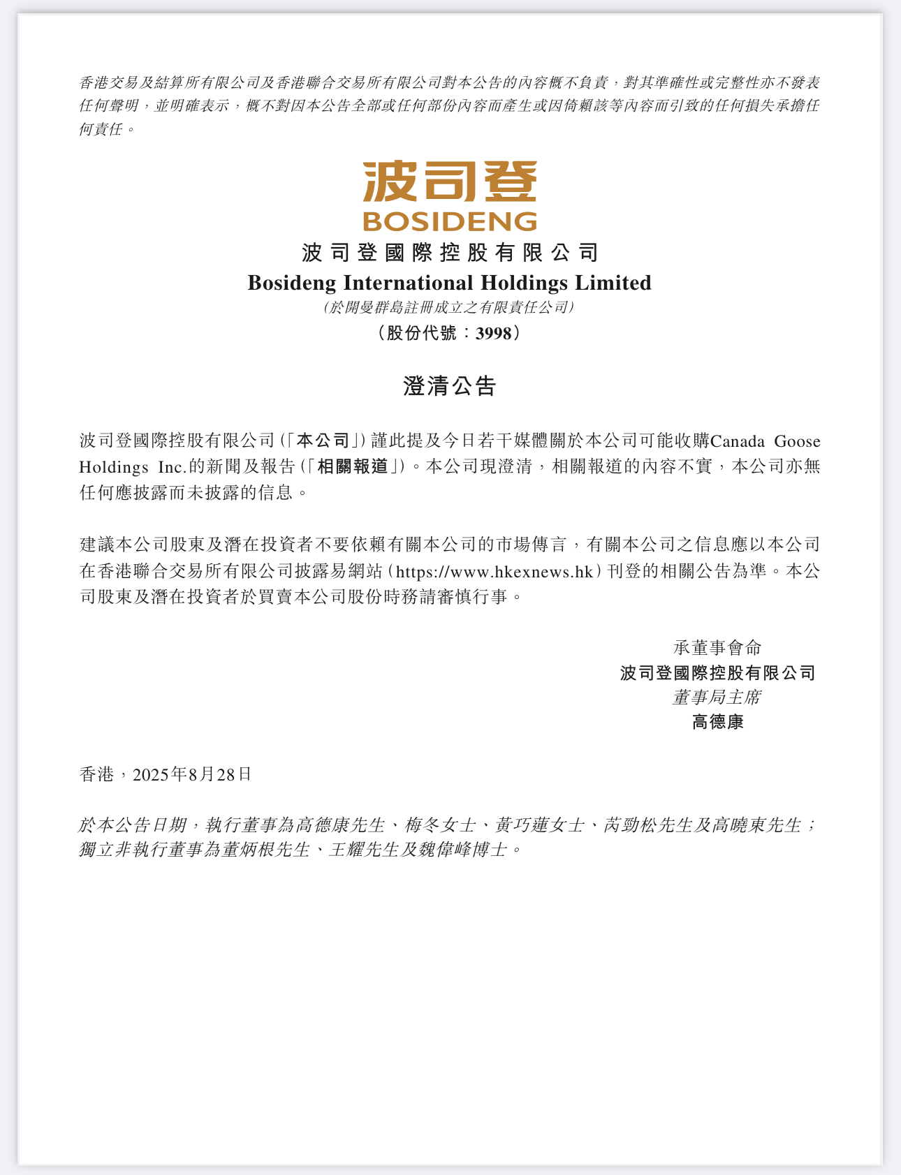 8月29日,波司登国际控股有限公司也在港交所发布公告称,公司谨此提及今日若干媒体关于公司可能收购Canada Goose Holdings Inc.的新闻及报告。公司现澄清,相关报道的内容不实,公司亦无任何愿披露而未披露的信息。(完)