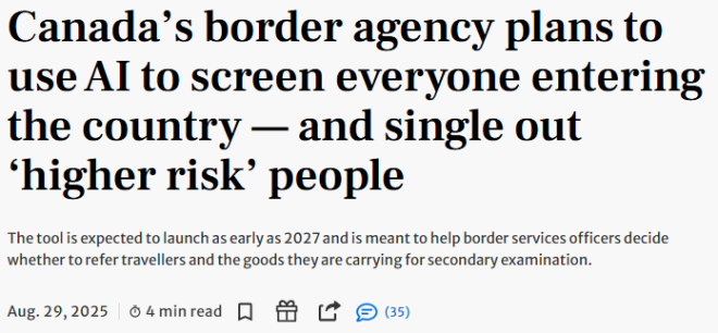 近日,加拿大边境服务局(CBSA)宣布,将在2027年前推出一款基于人工智能的“旅客合规指标”(TCI)系统,利用大数据和AI技术对所有入境和回国旅客进行风险评估,预测他们是否可能有违法风险。