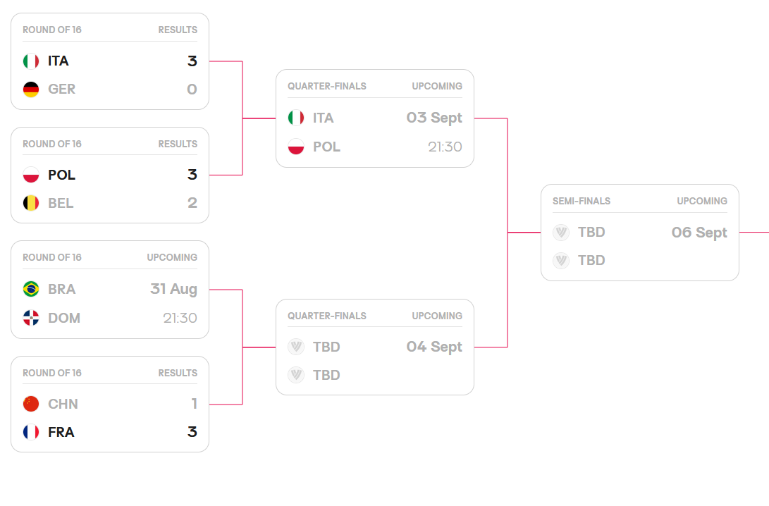 小组赛中,中国队先后以3:1的相同比分击败墨西哥队与哥伦比亚队,末轮3:0零封多米尼加队,从而以F组头名身份出线。处于C组的法国队战胜了波多黎各队和希腊队,在负于巴西队后以2胜1负的战绩排名小组第二晋级。