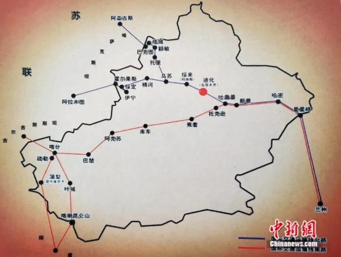 国际交通运输线示意图。新疆维吾尔自治区档案馆供图