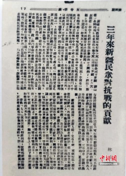 陈潭秋以“林浦”笔名在新疆《反帝战线》上发表文章《三年来新疆民众对抗战的贡献》。新疆维吾尔自治区档案馆供图