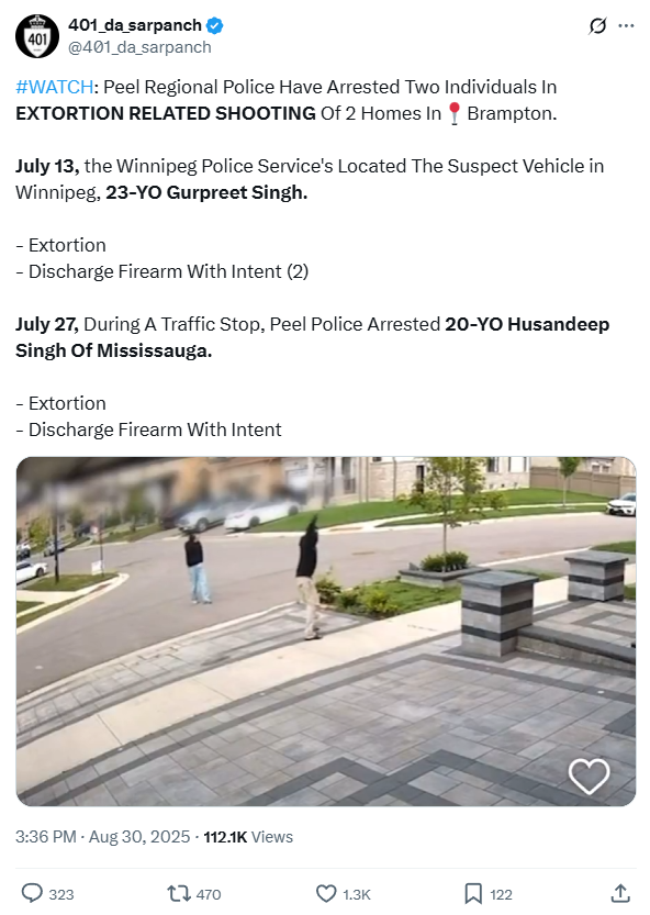 据大多伦多皮尔区警方周六(8月40日)报告,两名男子因涉嫌敲诈勒索被起诉,此前监控摄像头拍到上个月在Brampton一处住宅发生枪击事件。