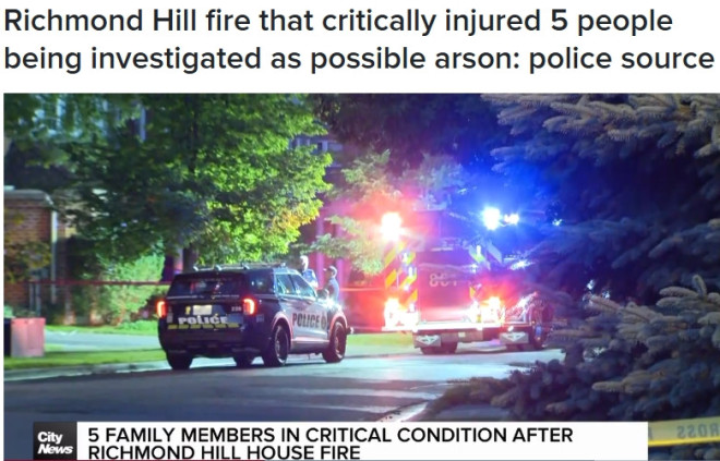 在9月1日劳工节凌晨,约克区烈治文山市一处民宅突发严重,导致包括一名儿童在内的五人伤势危重。警方消息人士向 CityNews 证实,该起火灾已作为潜在纵火案处理。