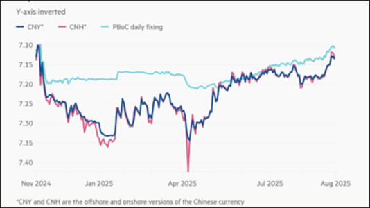 當地時間8月28日,人民幣中間價持續偏強,美元兌離岸人民幣(USDCNH)跌破7.15關口,當周收盤報7.1222,距離下破7.1已近在咫尺。據英國《金融時報》9月1日報道,今年以來人民幣已累計反彈2.3%,在中美貿易談判關鍵時期,人民幣升值引發資本市場廣泛關注。
