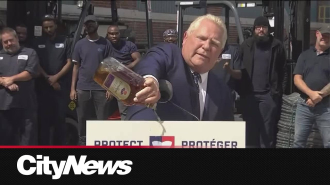 9月2日(周二),省长福特(Doug Ford)在基奇纳市的一场记者会上,罕见以“倒酒”示威,公开抨击知名威士忌品牌皇冠皇家(Crown Royal)的生产商帝亚吉欧公司(Diageo),指责其关闭本省装瓶厂、转移岗位至美国的决定是“愚蠢之举”(as dumb as a bag of hammers),并威胁在全省的LCBO发起“抵制运动”。