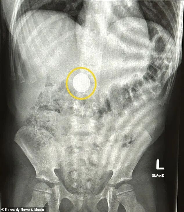 幸运的是,小Lily吞下的电池并未停留在食道中,避免了致命的化学灼伤。X光显示,电池已经进入她的肠道,虽然这依然是一个危险的状态。
