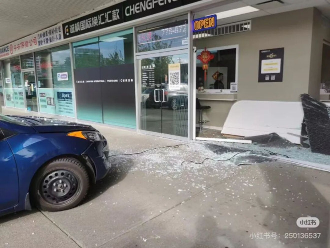 2025年7月,一辆蓝色汽车直接撞进八佰伴旁边的换汇店。