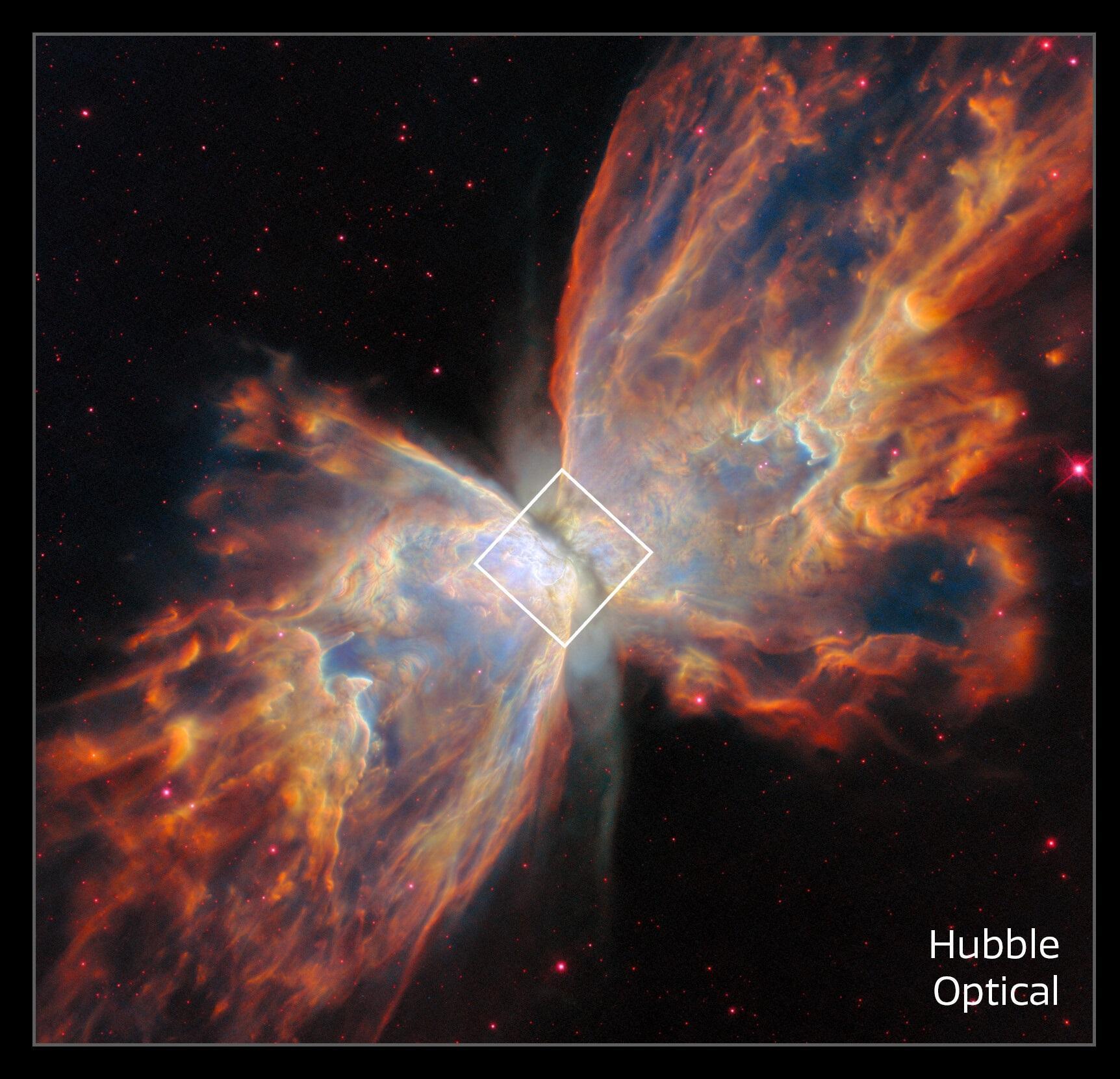 蝴蝶星云作为银河系研究最深入的行星状星云之一,早前曾被哈勃空间望远镜拍摄,但由于中心恒星被致密尘埃遮蔽,其确切位置始终未被确认。此次,韦布空间望远镜首次探测到恒星周围此前未被发现的尘云,并定位了这颗恒星。这一观测不仅揭示了其内部细节,也为研究地球及其他岩质行星的起源提供了重要参考。