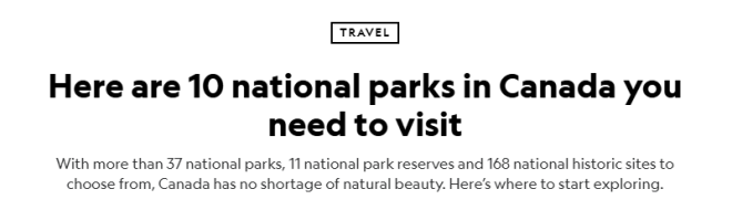 这篇周二发布的文章,题目叫《加拿大10座必去的国家公园》,重点介绍了加拿大境内的37个国家公园、11个国家公园保护区,以及168个国家历史遗址。