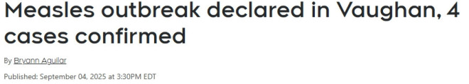 公共卫生部门宣布,在旺市(Vaughan)出现了麻疹疫情,目前已确诊4例。