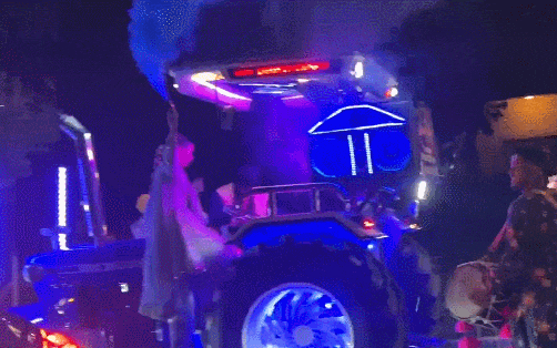 视频显示,一辆拖拉机被改装称了花车,并配有大量LED灯,在小区街道缓慢行驶。在花车后面,数十名印度人随着音乐一边跳舞,一边欢呼,有人举着喜庆的道具,还有人拿着营造氛围的彩色烟雾棒。