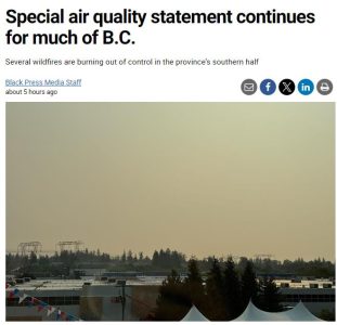 進入9月,BC省不少地區天空一片灰濛。由於山火肆虐,加拿大環境部在周五(9月5日)凌晨再次發布特殊空氣質量聲明,提醒未來24至48小時內,全省大部分地區仍將受到野火煙霧影響。