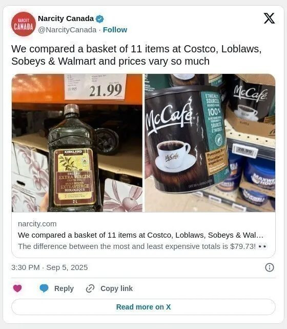 近日,《Narcity》对加拿大四大连锁超市——Costco、Loblaws、Sobeys 和 Walmart 的11种常见食品进行比价,结果显示:总价最贵与最便宜的购物篮之间相差高达79.73加元