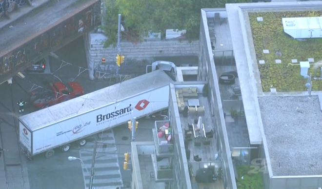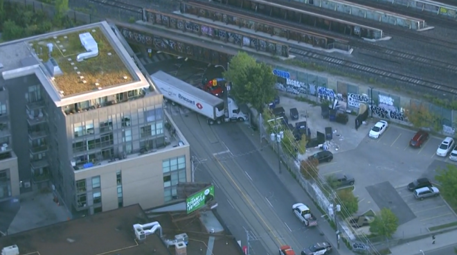 多伦多警方表示,一辆拖挂卡车在Parkdale撞上了候车亭,但无人受伤。