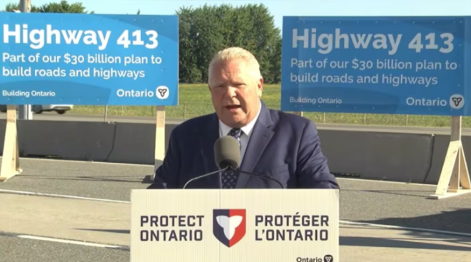 前保守党省长迈克·哈里斯(Mike Harris)的政府在1999年以99年期、31亿加元的价格把这条高速公路出售给一个公司财团。这一举措几十年来一直颇具争议,因为多伦多周边的路费和拥堵都在上升。福特曾对这桩出售表达不满,称其是一个错误。