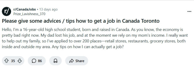 他写道:“我是16岁的加拿大人,父亲失业后全家依靠母亲的收入维持。我想帮家里减轻压力,于是申请了200多份工作——零售、餐厅、超市,包括家附近和以外的地方,但至今没有一份录取。”