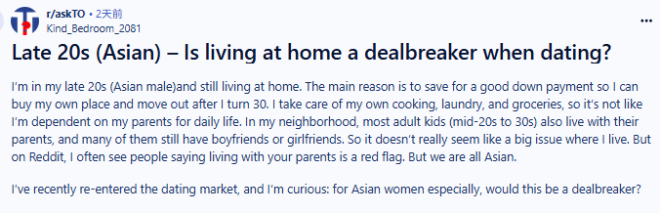 “但我经常在Reddit上看到,有人说‘成年还和父母同住是个恋爱红旗(red flag)’。我最近重新开始约会,我很好奇:尤其是对亚洲女生来说,和父母住在一起会成为‘拒绝交往的理由’吗?”