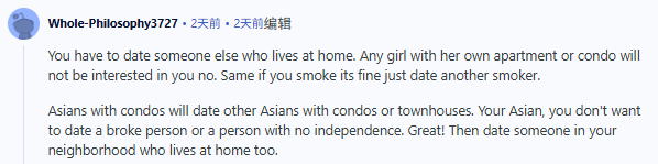 “你只能去约会同样还住在家里的人。就像如果你抽烟,没问题,那就找个也抽烟的人约会。有自己房子的亚裔,只会跟同样有公寓或联排别墅的亚裔约会。你是亚裔,你不想跟一个穷人或者没有独立能力的人约会,那你就去找一个也住在家里的人谈恋爱吧。”