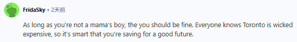 “只要你不是妈宝男,应该就没问题。大家都知道多伦多生活成本贵得离谱,所以你存钱为未来做打算很明智。”