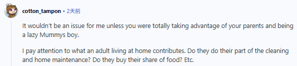 “对我来说,这并不是什么问题,除非你完全是在啃老,或者是个妈宝男。我会在意一个成年人如果还住在家里,是否有在承担应尽的责任。比如:有没有参与打扫卫生、家务维护?有没有自己买该分担的食物?等等。”