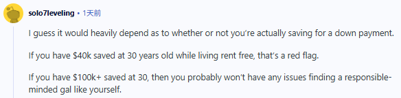 “我认为这很大程度上取决于你是否真的在为首付款存钱。如果你30岁时靠免租生活存了4万,那可就危险了。但若30岁时存了10万以上,那你应该不难找到像你这样有责任心的姑娘。”