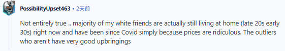 “也不完全正确……我大多数的白人朋友现在其实还住在家里(大多是20岁后期到30岁出头),自从疫情以来就一直这样,主要是因为房价太离谱了。那些已经搬出去的通常家庭条件都很好。”
