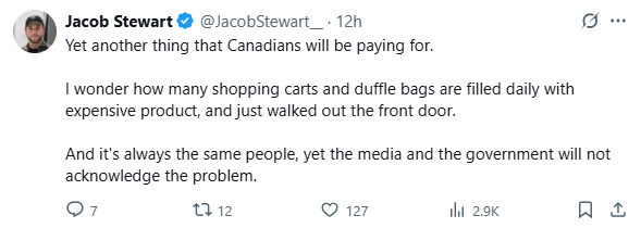 “这又是一件加拿大人要买单的事情。我想知道每天有多少购物车和行李袋装满昂贵的商品,然后就走出店门了。而且总是同样的人,但媒体和政府却不愿承认这个问题。”