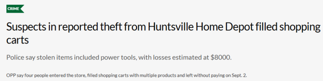 警方表示,9月2日下午约5点15分,四人被怀疑在Home Depot家居建材商店内,将电动工具和其他商品装满购物车后,未付款就离开。估计损失约8,000加元。