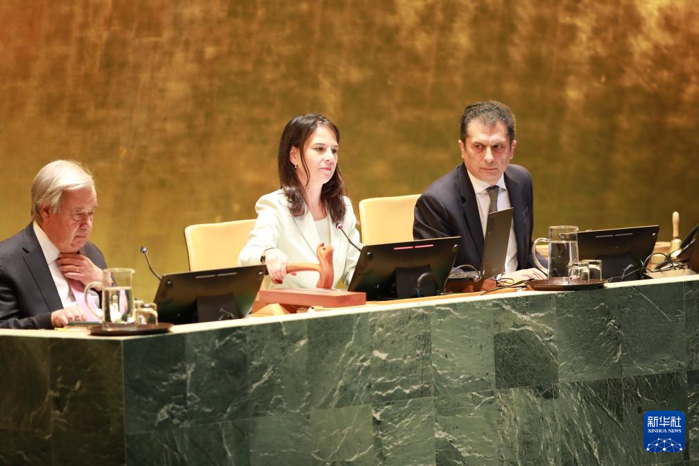 9月9日,第80届联合国大会主席安娜莱娜·贝尔伯克(中)敲槌宣布第80届联大第一次全会开幕。
