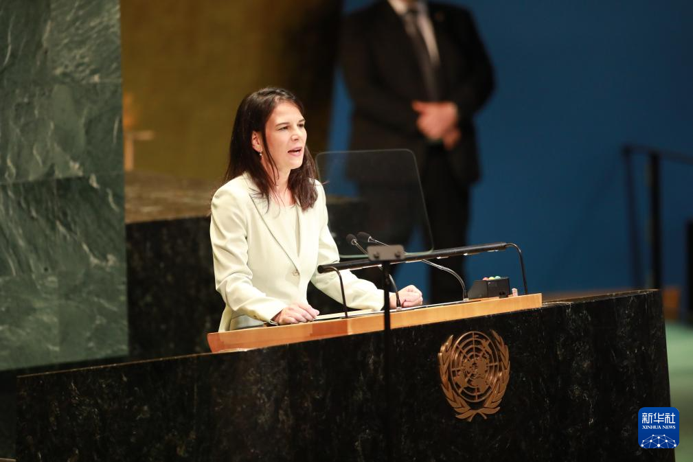 9月9日,第80届联合国大会主席安娜莱娜·贝尔伯克在第80届联大第一次全会上讲话。