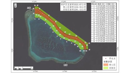 根據國家林草局公告的黃岩島國家級自然保護區基本情況,黃岩島國家級自然保護區位於海南省三沙市,面積3523.67公頃,其中核心區面積1242.55公頃,實驗區面積2281.12公頃,主要保護對象為珊瑚礁生態系統。