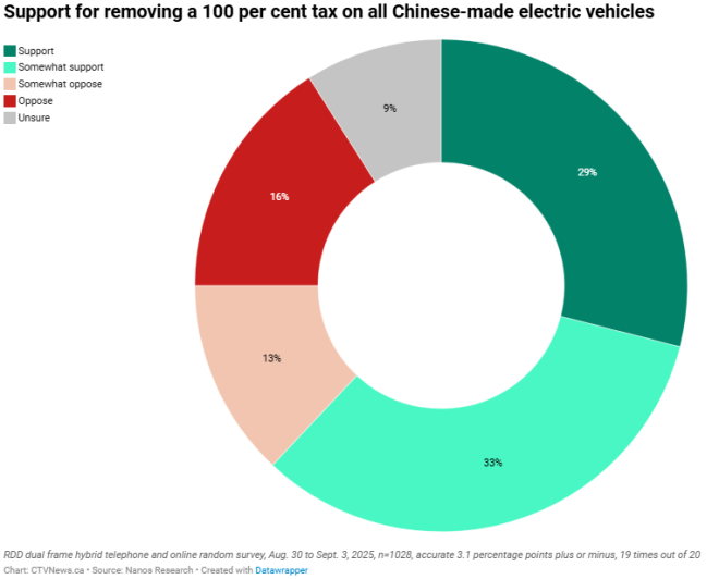 调查显示,29%的人支持取消对中国产电动车征收的100%关税,以换取中方取消对加拿大油菜籽的高关税。33%表示福分支持。