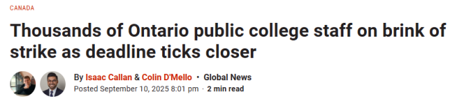 随着安省各地(苏圣玛丽、基奇纳、奥沙瓦等)大专课程全面开学,罢工将使学院的关键服务陷入停顿。各学院将会在不同时间、地点设立纠察线。