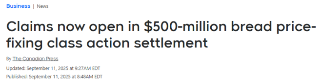 加拿大购物者如今有机会领取一份涉及5亿加元和解金的赔偿,该款项来自一起关于面包行业涉嫌价格操纵的集体诉讼。