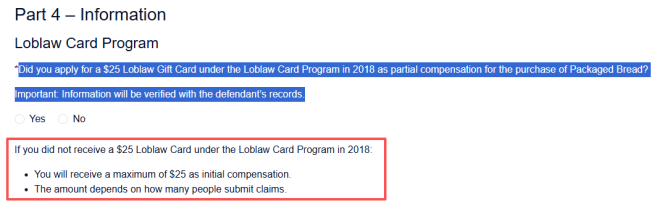 在2001年至2021年间购买过面包、且未领取过Loblaw25加元购物卡(2018年的部分补偿计划)的消费者,最终可获得最高25加元的赔偿。