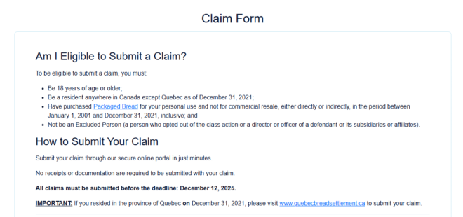 - 截至2021年12月31日仍居住在魁北克省的消费者,则需前往QuebecBreadSettlement.ca提交。