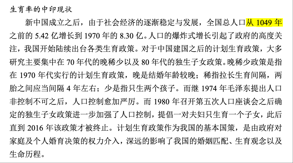 杨某媛的论文中,最容易被注意到的便是全篇多处明显的“笔误”。例如,杨某媛论文中摘要部分的中英文关键词并不一致,比如“母职惩罚”和“Outside Option”,后者意为外部选择权。研究背景第二页出现《离婚法》,而至今国内未曾颁布《离婚法》。论文第四页出现“全国总人口从 1049 年之前的 5.42 亿”的描述,其实应为1949年。刘婧表示,这类低级错误的出现频率已到了“导师看一眼就会打回去”的程度。